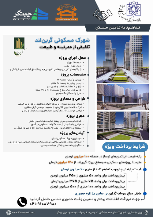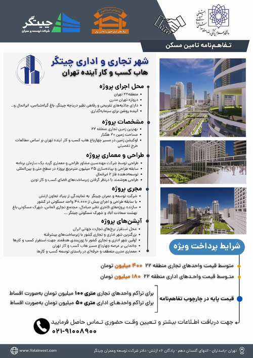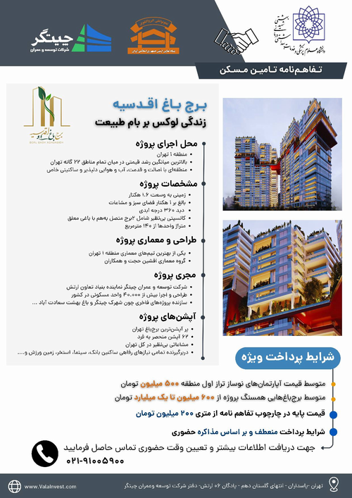 همکاران عزیز می توانند برای دریافت معرفی نامه الکترونیکی بازدید از این پروژه به سامانه بهشتی پلاس مراجعه نمایند و پس از هماهنگی با دفتر فروش برای پروژه اقدسیه با شماره 91005900 و پروژه گرین لند چیتگر با شماره 91007900 و شهر تجاری اداری چیتگر با شماره 91008900 از مجموعه بازدید و در صورت تمایل به خرید واحد، جهت ثبت در سامانه بهشتی پلاس اقدام نمایند .
