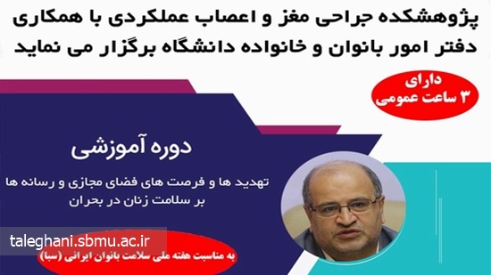 به اطلاع می رساند پژوهشکده و مرکز تحقیقات جراحی مغز و اعصاب عملکردی و دفتر امور زنان و خانواده دانشگاه در نظر دارد به مناسبت هفته ملی سلامت بانوان ایران (سبا) و بر اساس روز شمار هفته مذکور، وبینار آموزشی «تهدیدها و فرصت های فضای مجازی و رسانه ها بر سلامت زنان در بحران» را روز شنبه مورخ 1404/07/26 ساعت 12:30 برگزار نمایند. این وبینار دارای 3 ساعت عمومی جهت درج در کارنامه ارزشیابی سالانه کلیه کارکنان دانشگاه می باشد. شایان ذکر است که برای استفاده از این برنامه، ثبت نام از طریق لینک مندرج در پوستر پیوست شده، ضروری می باشد. شرکت در آزمون برنامه برای کسب امتیاز مذکور ضروری بوده و تاریخ برگزاری آن 1404/07/27 لغایت 1404/07/29 و از طریق سامانه آموزش کارکنان دانشگاه خواهد بود .